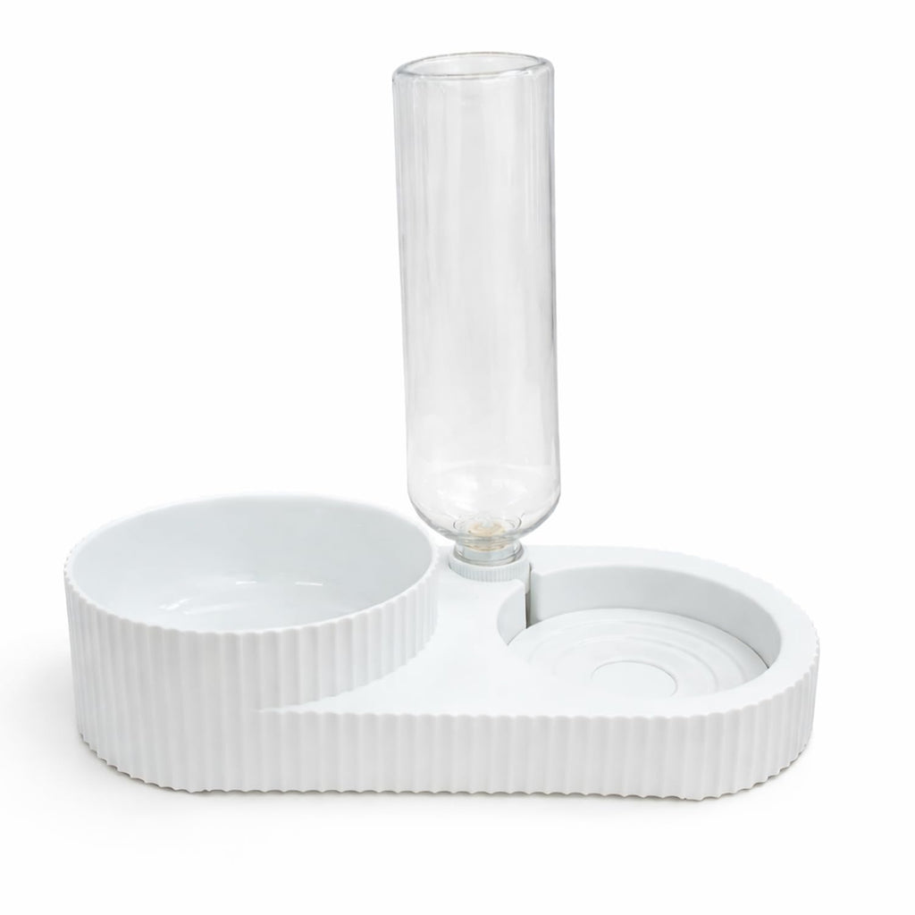 - 3-in-1 design with food feeder, water dispenser, and tray